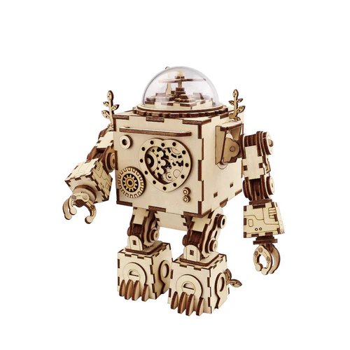 Mit über 220 Teilen und einer Größe von fast 20 Zentimetern hat Orpheus eine Schwierigkeitsbewertung von 4 von 5 Sternen. Ein unerfahrener Hobbybauer braucht einen Tag, um es zusammenzubauen. Sehr schön zum basteln mit Kindern! Die sechs Holzplatten haben lasergeschnittene Puzzleteile. Sie schieben diese heraus und setzen sie hauptsächlich mit Schlitz- und Zapfenverbindungen zusammen. Im Gegensatz zu den meisten ROKR Modellbausätze wird dieses Bastelset mit einer Tube Klebstoff geliefert, um beispielsweise die Platten an Beinen und Armen zu kleben.