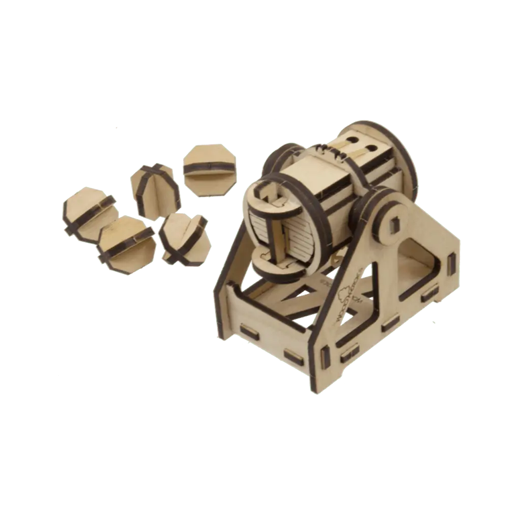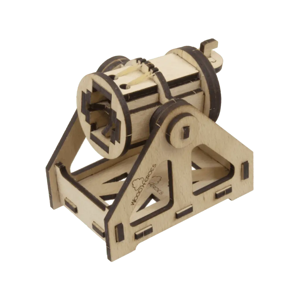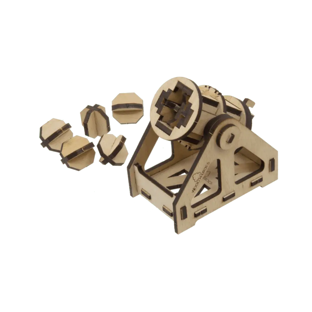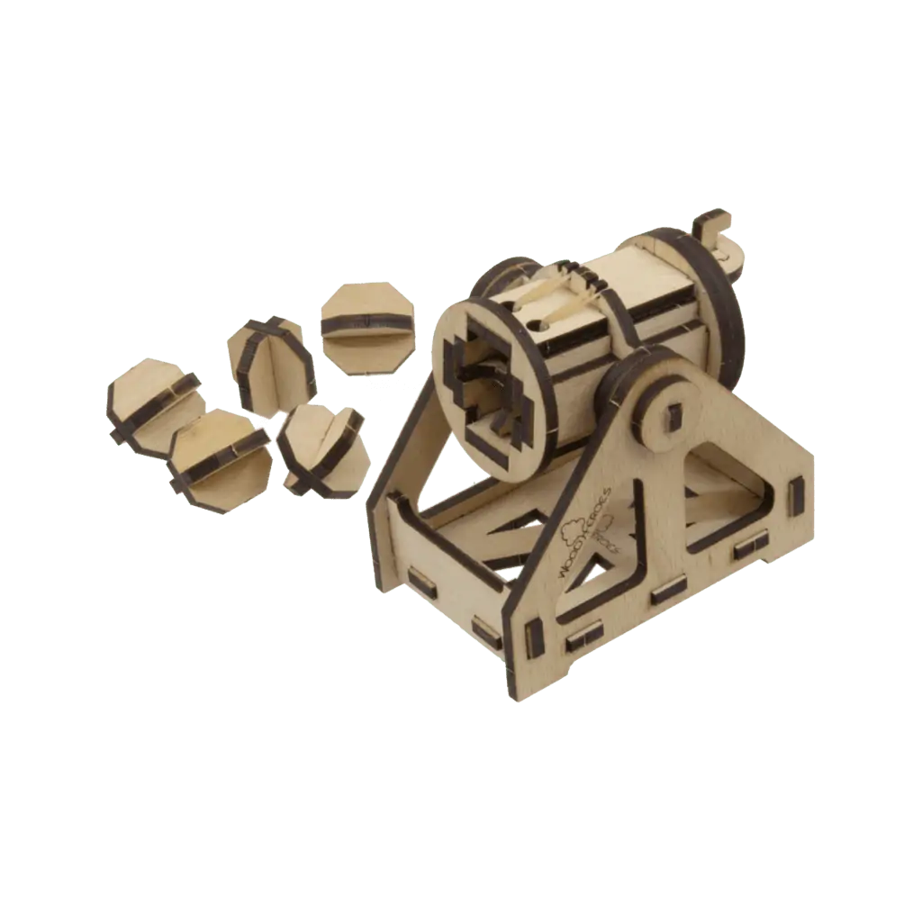Der voll funktionsfähige 45-teilige Bausatz aus Buchensperrholz (2 Platten) ist 4 mm dick und mit dem Laser vorgeschnitten. Er wird inklusive 6 Stück Munition, Schmirgelpapier, Zielscheiben, Gummiringe, Schnur als Montagehilfe, Leim und Bauanleitung in einer Kartonverpackung geliefert.
