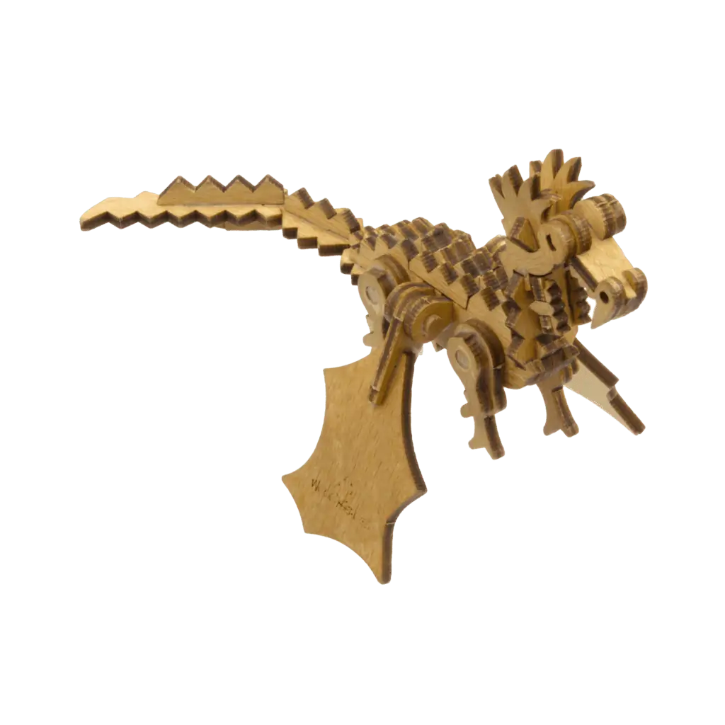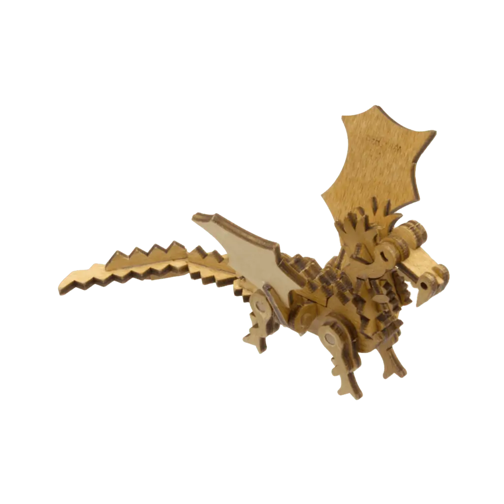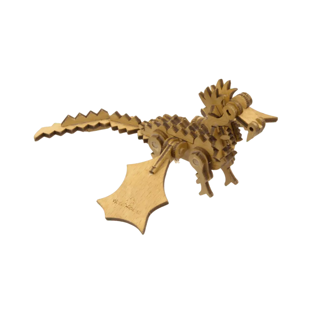 Der Bausatz wird inklusive Buchenholzstäbchen, Schmirgelpapier, Drachenhöhle aus 2 Blatt dünnem Karton, Leim und Bauanleitung in einer Kartonverpackung geliefert.