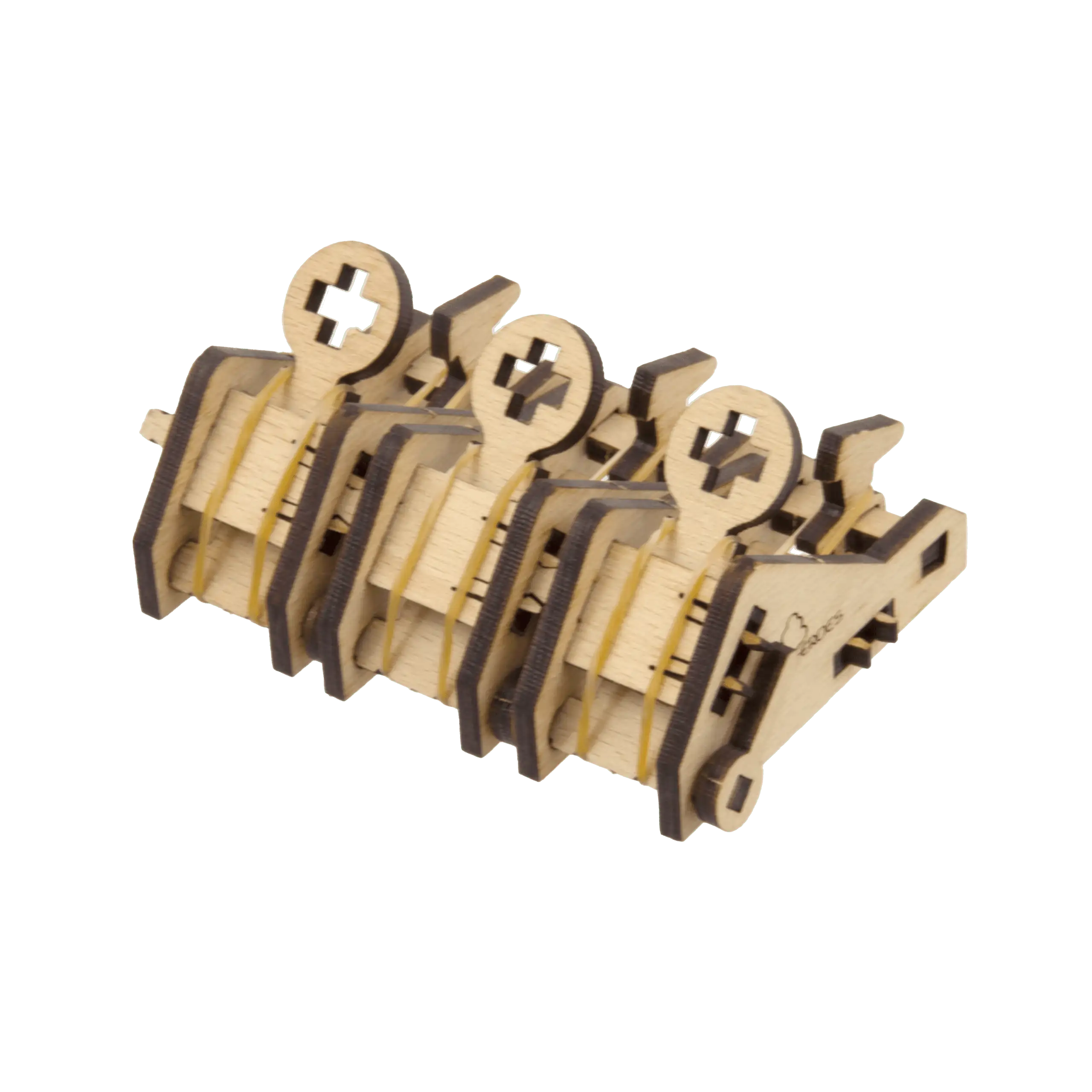Mit dem Serienkatapult aus Buchensperrholz kann mit weiteren Katapulten derselben Seriennummer eine beliebig lange Reihe an Katapulten gebaut werden, welche alle einzeln oder auch in Serie mit nur einem Fingerdruck abgefeuert werden können.
